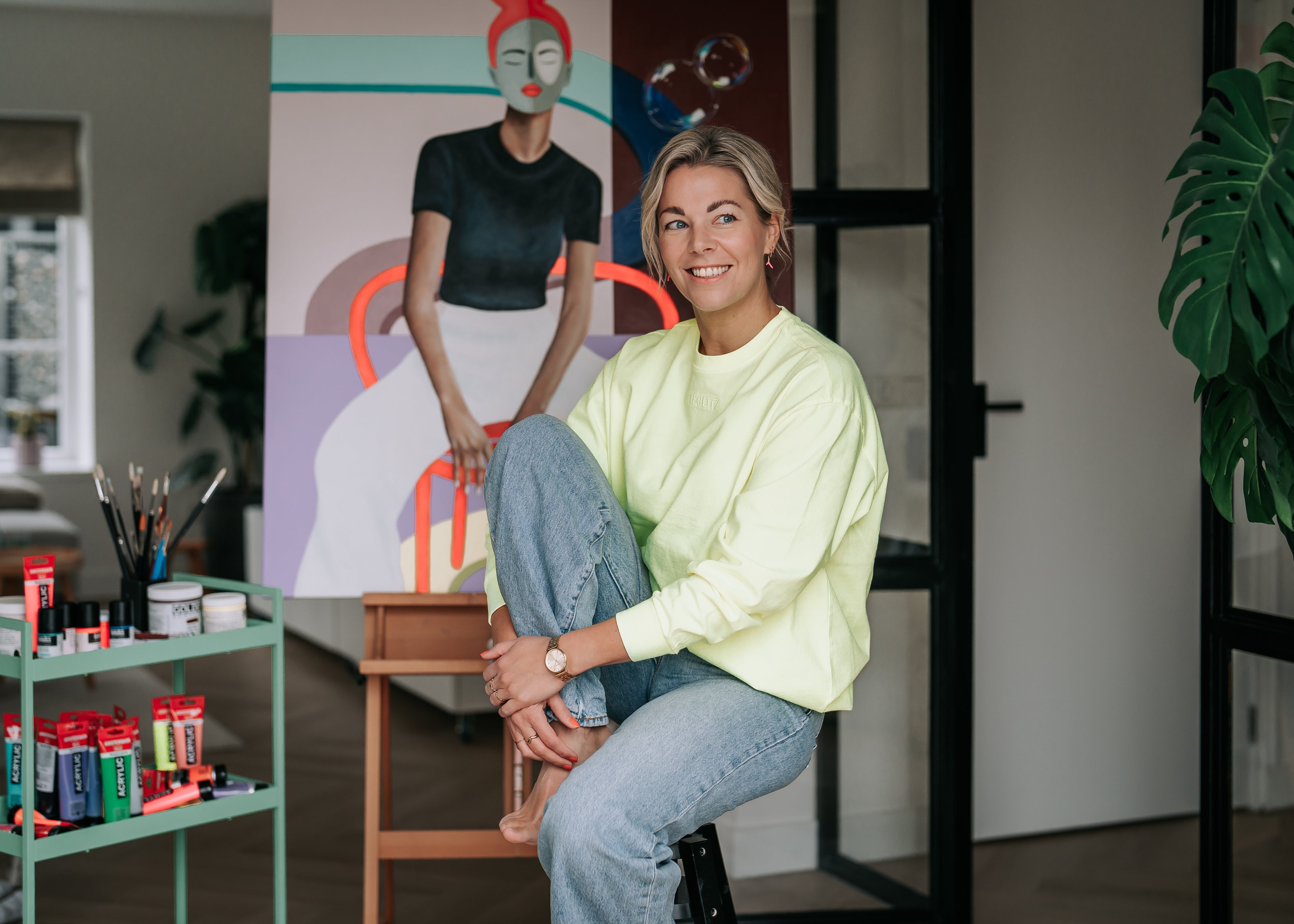 Mijn schilderijen tonen vrouwen in verandering: kwetsbaar door gesloten ogen, krachtig door kleur.